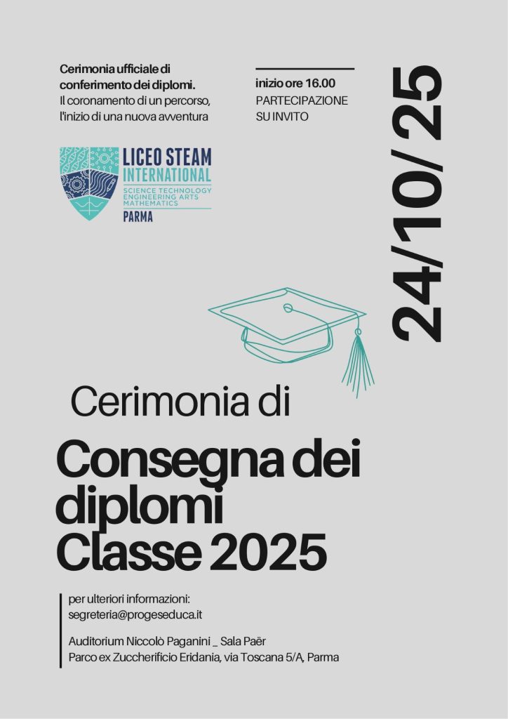 È con grande orgoglio e sincera emozione che il Liceo STEAM International di Parma annuncia la Cerimonia di consegna dei diplomi di maturità alla classe del 2025, la prima ad aver completato il percorso quadriennale sperimentale del nostro liceo.
